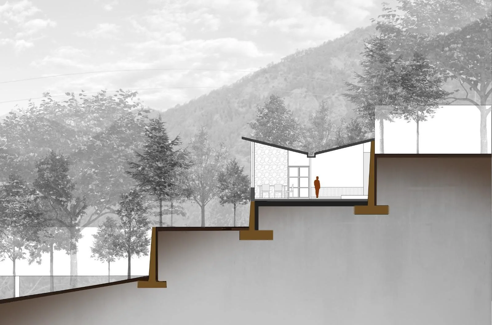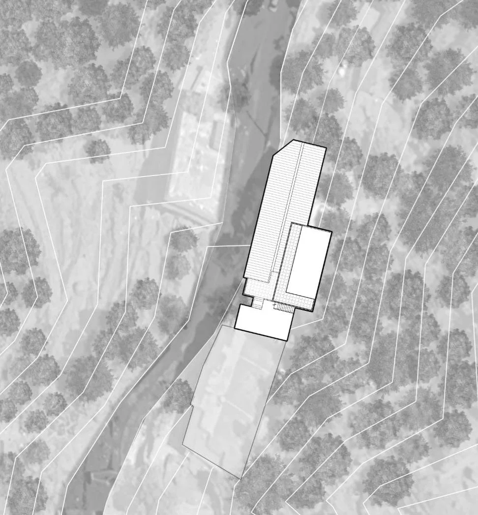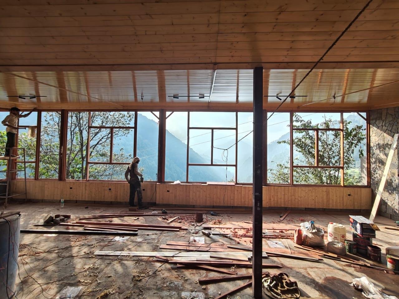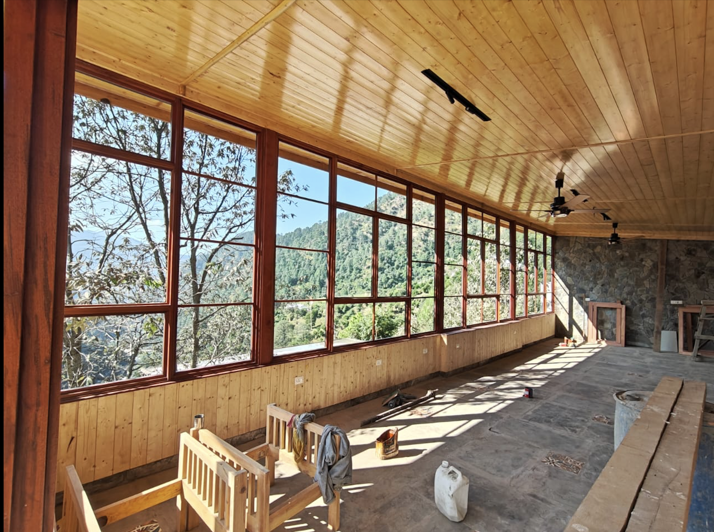 The sliver of building is built along the thin contours, which are almmost 1:3 or 1:4 steep slope. The butterfly roof stands out when seen along the section of the mountain, with its views opening up with a glazed facade towards the west ,mnmerging the inside and outside and borrwing the viewds of the mouuntains as if it were part of the building. The retaining wall is built from the excavated materials of the mountain, such that one feels that they are part of the mountain. The pine wood false ceiling adds warmth to the space and gives a semlbance of being below the canopy of the trees of the temperate himalayan region. The light from the setting sun filter beautifully into the space through the fenestration details, creating an array of shadows on the slate flooring.