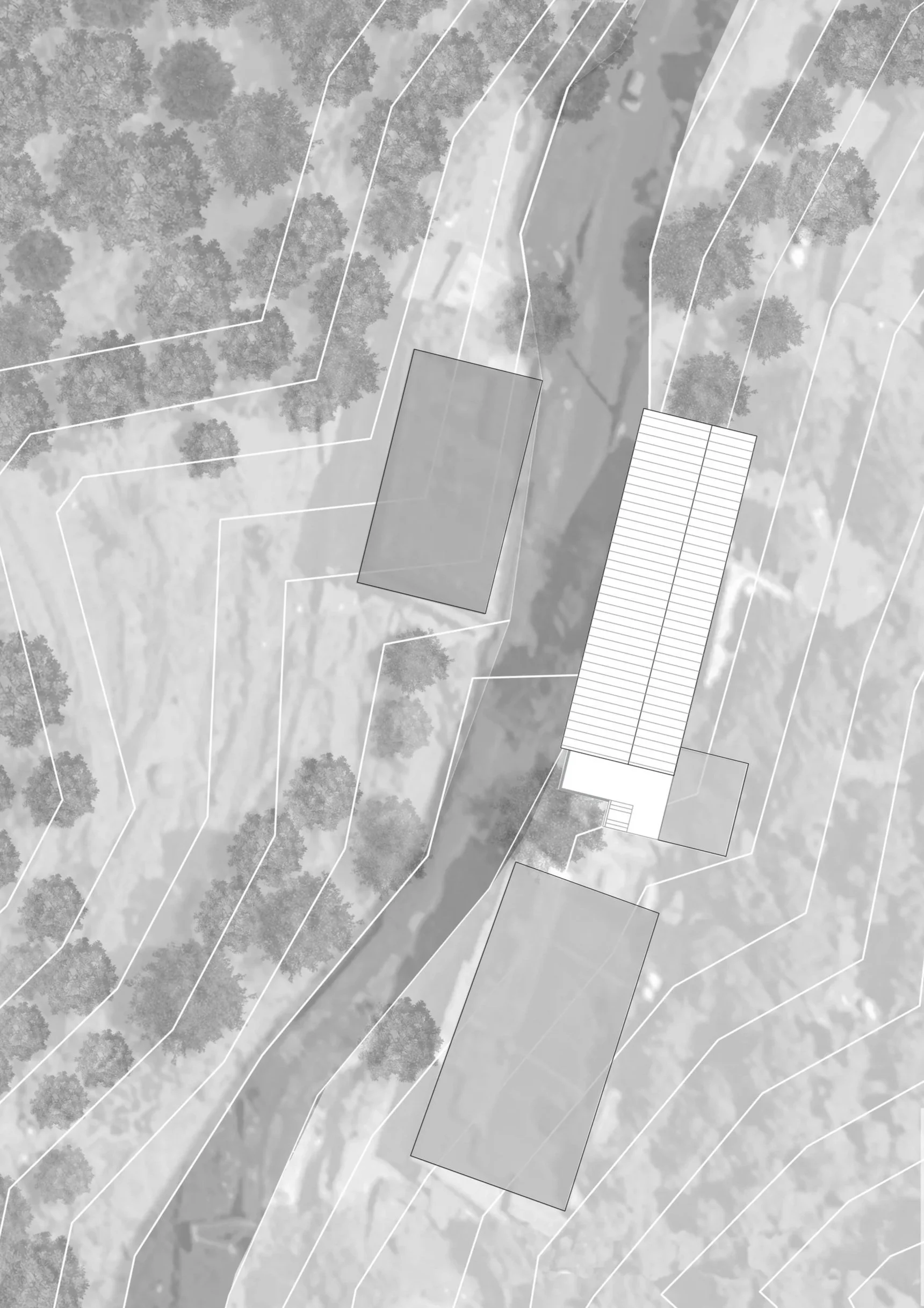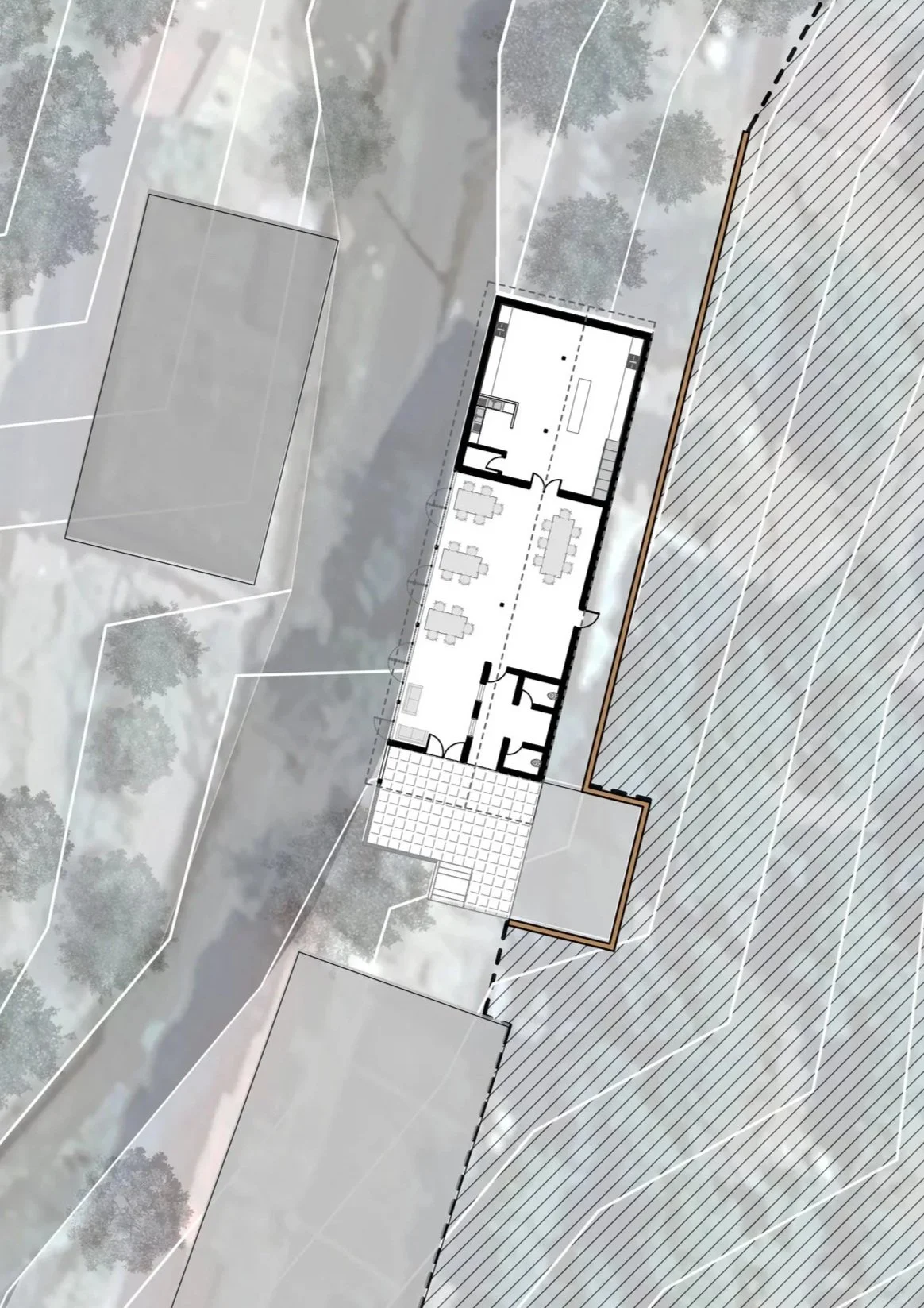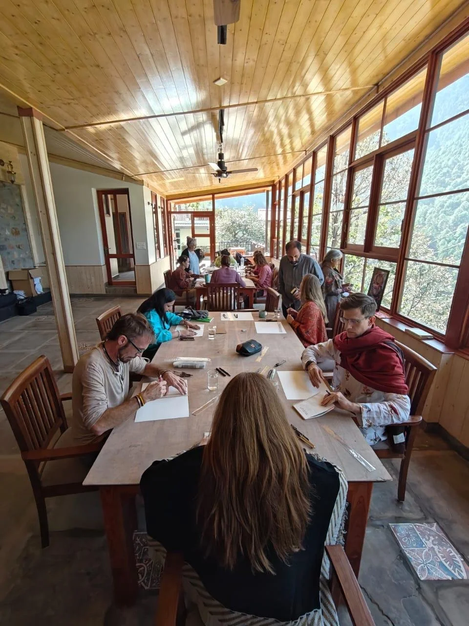 The sliver of building is built along the thin contours, which are almmost 1:3 or 1:4 steep slope. The butterfly roof stands out when seen along the section of the mountain, with its views opening up with a glazed facade towards the west ,mnmerging the inside and outside and borrwing the viewds of the mouuntains as if it were part of the building. The retaining wall is built from the excavated materials of the mountain, such that one feels that they are part of the mountain. The pine wood false ceiling adds warmth to the space and gives a semlbance of being below the canopy of the trees of the temperate himalayan region. The light from the setting sun filter beautifully into the space through the fenestration details, creating an array of shadows on the slate flooring.