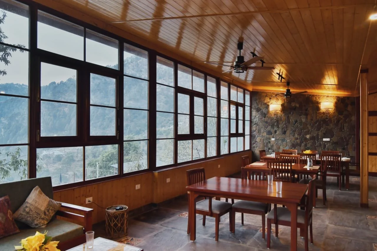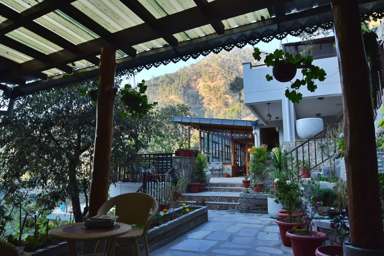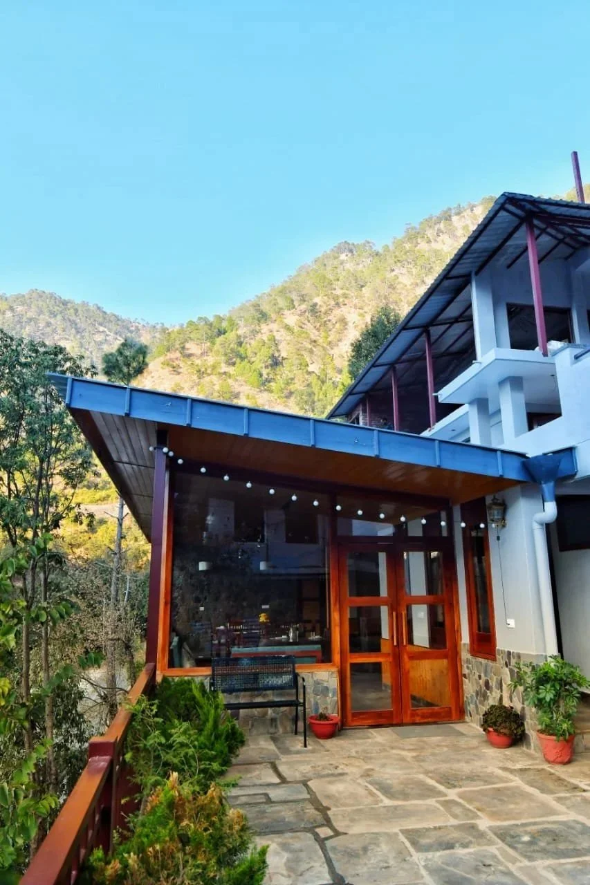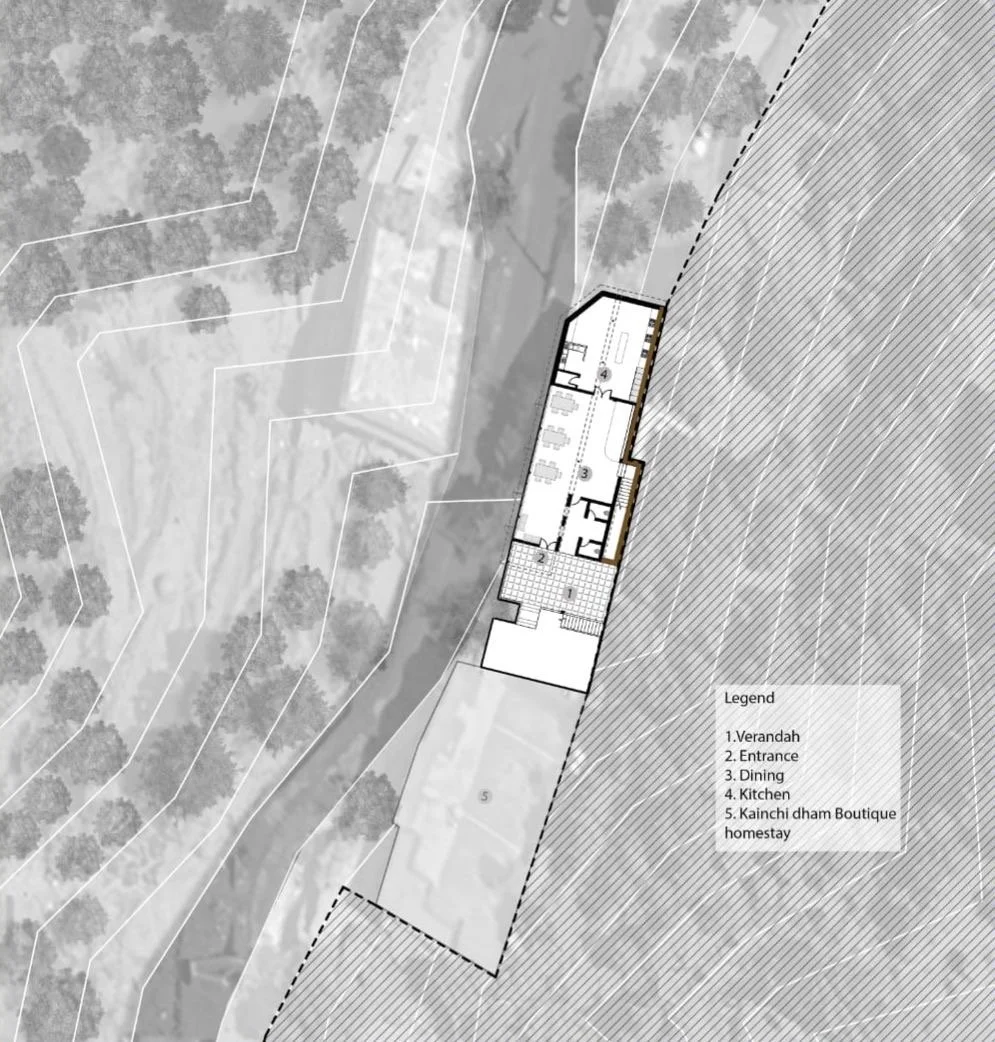 The 1500 sq foot bulding is an extension to an existing boutique home stay perched atop a 1:4 steep mountain in the Kumaon region of Nainital. The building is built across a ridge and faces the beautiful forested valleys.