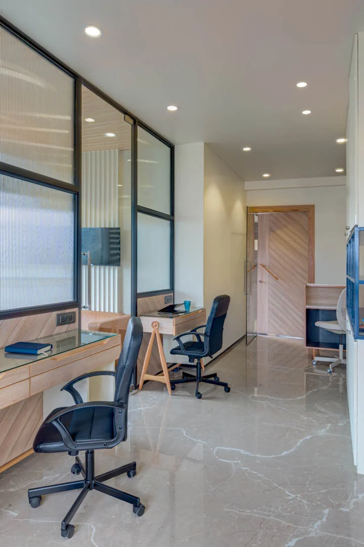 A tight office space in Mumbai designed for an export company. The space - as we saw it, was flooded with light which allowed us to work around with the client’s high requirements in a tight space. The glass partition allows the spaces to flow into eachother while still enabling privacy required in the cabins.